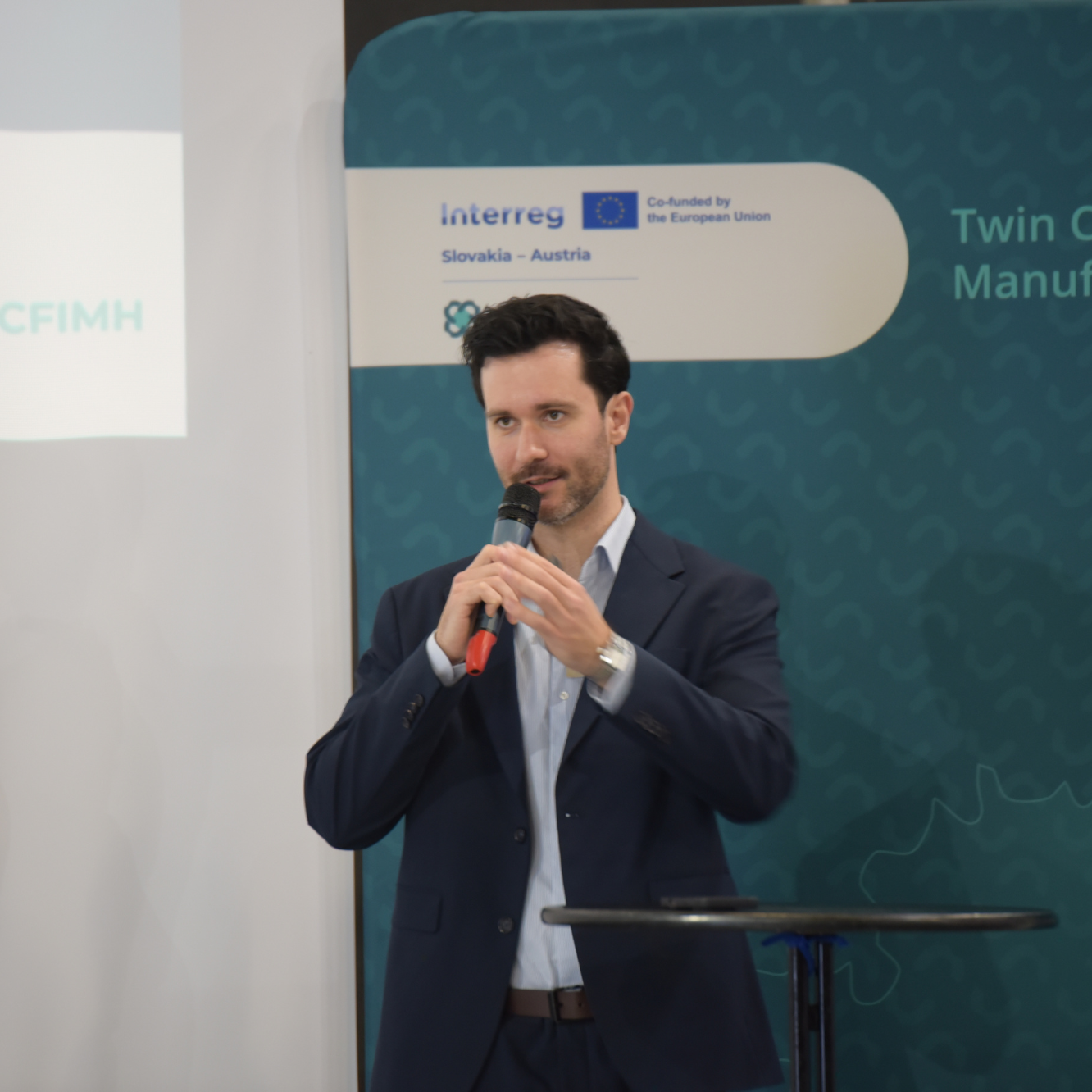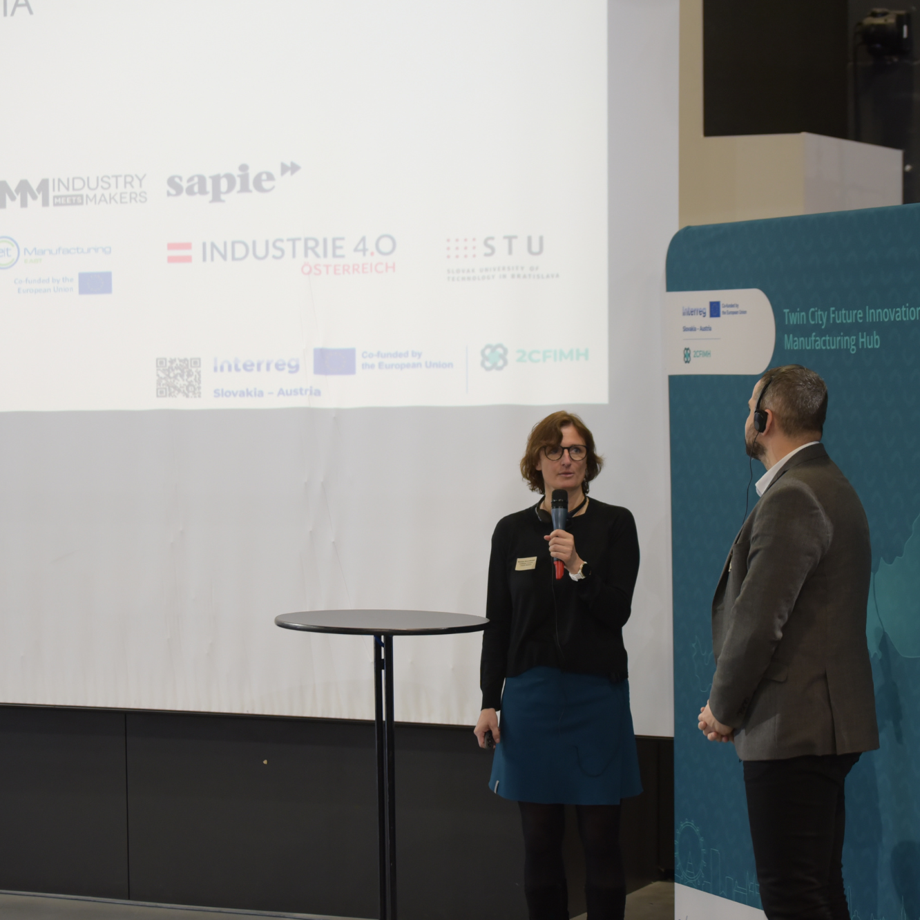Roland Sommer z Plattform Industrie 4.0 Österreich a Milan Husár zo Slovenskej technickej univerzity v Bratislave vysvetlili cieľ pracovného balíka 5: škálovanie a integrácia inovácií do štruktúrovaného cezhraničného priemyselného ekosystému pomocou participatívneho komunikačného modelu s cieľom dosiahnuť nepretržitý tok inovácií, odborných znalostí a strategického zosúladenia v rámci projektu.